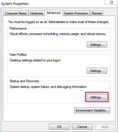 - Vaya a la pestaña Avanzadas y haga clic en Configuración en Inicio y recuperación.