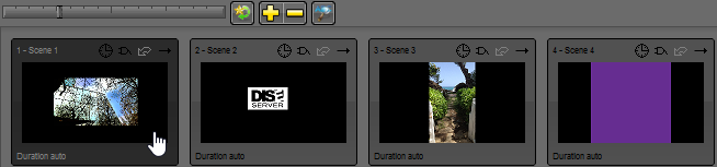 Encima de los iconos de escena hay una barra de herramientas con un deslizador de zoom y tres botones. El control deslizante del zoom determina el tamaño de los iconos de la escena.