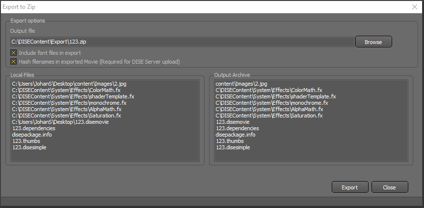 Recuerde que, aunque las fuentes se exportarán al archivo zip, deberá añadir el subdirectorio "Fonts" a la pestaña Fonts del Compositor,