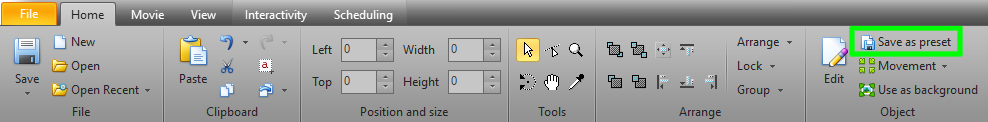 Todos los objetos de INNDS Composer pueden guardarse como preajustes. Los preajustes mantienen todas las propiedades del objeto, como los movimientos y los efectos.