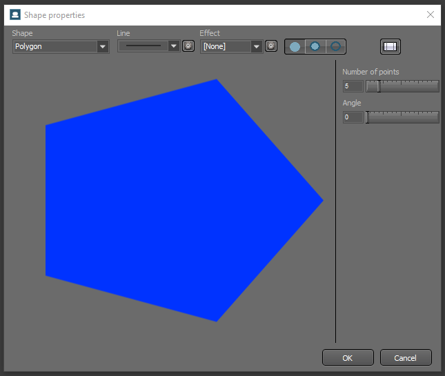 Hay diferentes formas que se pueden utilizar para componer su escena, puede añadir un Rectángulo, Círculo, Rectángulo redondeado o Estrella directamente a su presentación o modificar cualquiera de ellos en la ventana Editar forma. Desde esta ventana también puedes acceder a las formas Línea, Curva, Curva de Bézier, Arco, Pastel, Triángulo y Polígono.