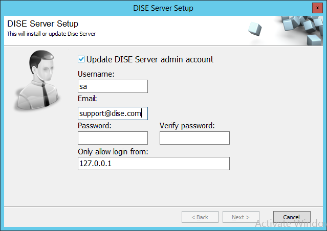 Compruebe la actualización de la cuenta de administrador del Servidor INNDS, y se le presentará la opción de escribir una nueva contraseña para el usuario #1, que es el superadministrador principal (sa).
